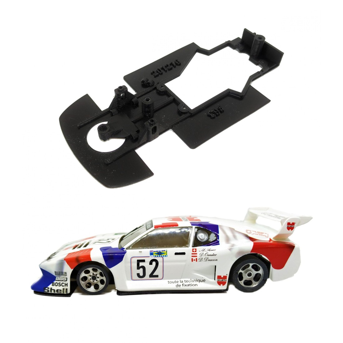 Chasis 3D para BMW M1 Gr.5 de Scaleauto con bancada independiente en angle winder, side winder o en línea. Para este modelo hay dos tipos de carrocerías: con tetones cortos y tetones largos. Esta referencia sería para la carrocería de tetones cortos. La carrocería de tetones cortos va con el chasis en side winder. La carrocería de tetones largos va con el chasis en angle winder. Compatible con soporte motor tipo Slot.It y con guías de 3,5 mm de diámetro. Eje delantero regulable en altura. Con pasacables.