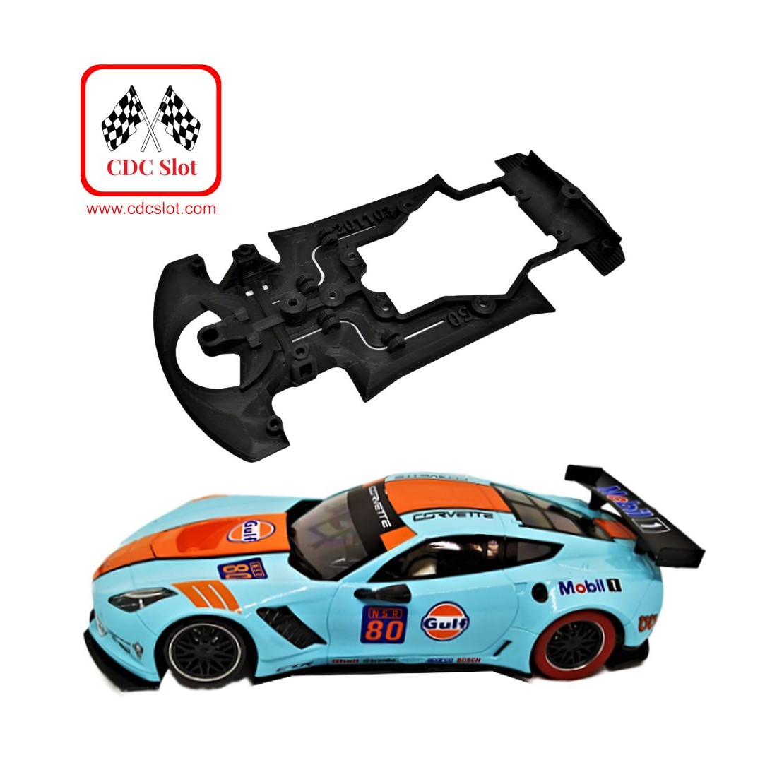 Chasis 3D en anglewinder para Corvette C7R de NSR. Sistema modular para regular la torsión del chasis mediante tornillos allen M2 con cuatro puntos de fijación. Eje delantero regulable en altura mediante tornillos allen M2. Con pasacables. Compatible con soporte motor tipo Slot.It, Scaleauto o CDC Slot y con guías de 3,5 de diámetro en su eje. Flexible y resistente.