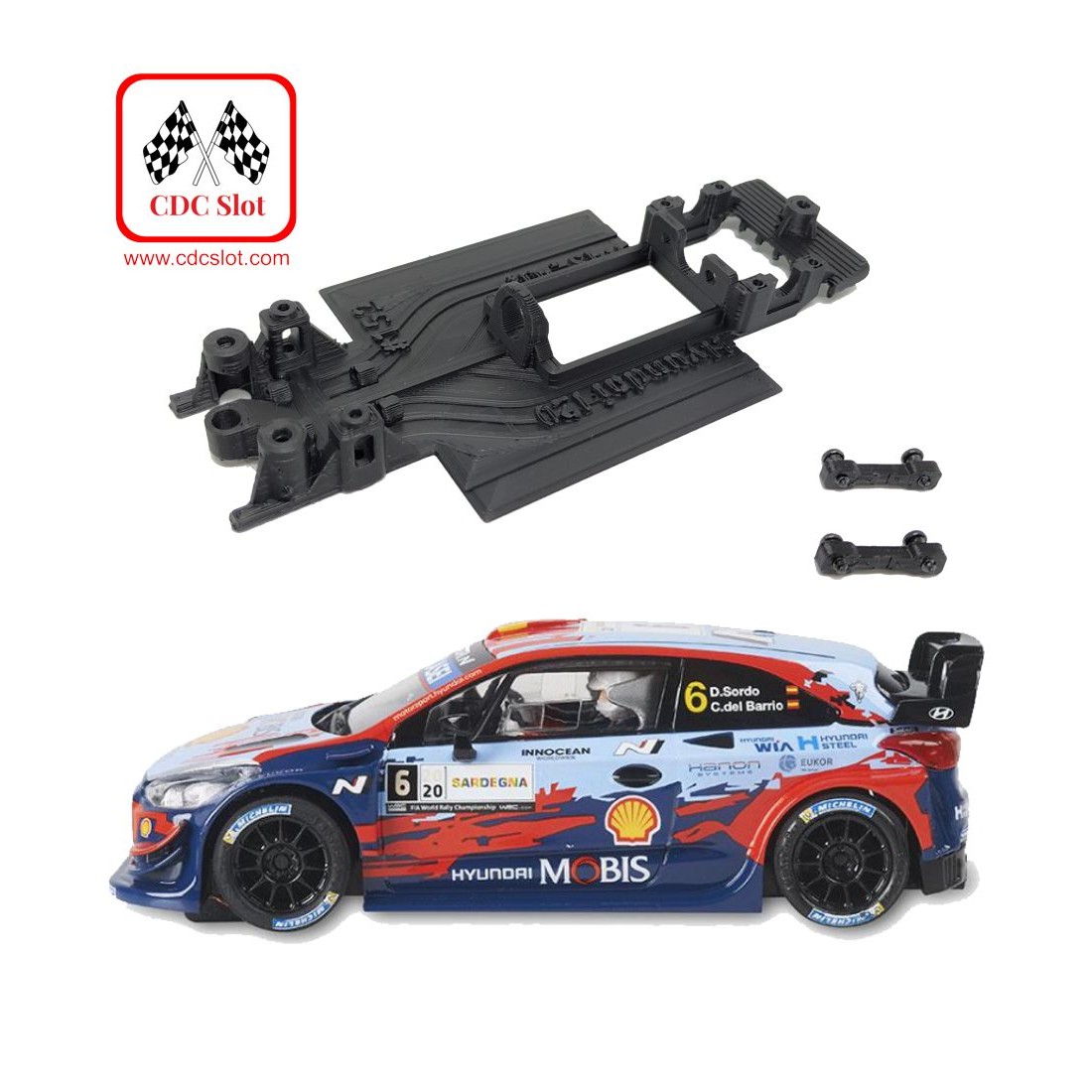 Chasis 3D para Hyundai i20 WRC de Scalextric con bancada en monoblock y posición del motor en línea. Eje delantero regulable en altura mediante tornillos allen M2. Con pasacables. Compatible con motor de caja larga y con guías de 3,5 mm de diámetro en el eje. Flexible y resistente.