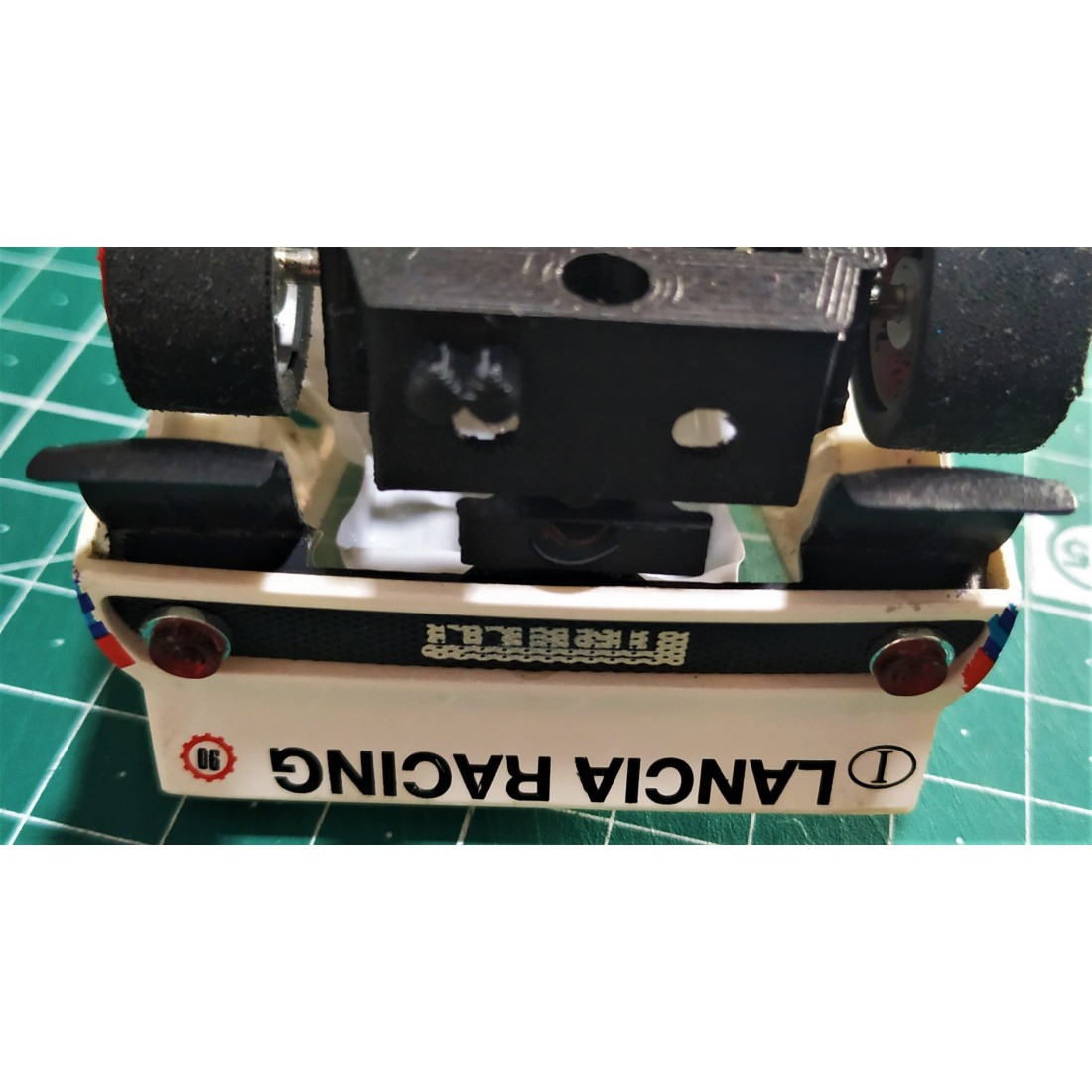 Chasis 3D para Lancia 037 de Scalextric. Diseñado en monoblock y con el motor en línea. Incluye un segundo tetón para colocar en la parte trasera de la carrocería, mejorando la basculación. También incorpora una pieza frontal con los faros e intermitentes para sustituir al original y así poder adelantar la guía. Eje delantero regulable en altura mediante tornillos allen M2. Con pasacables. Apto para motores de caja larga y compatible con guías de 3,5 mm de diámetro en el eje.