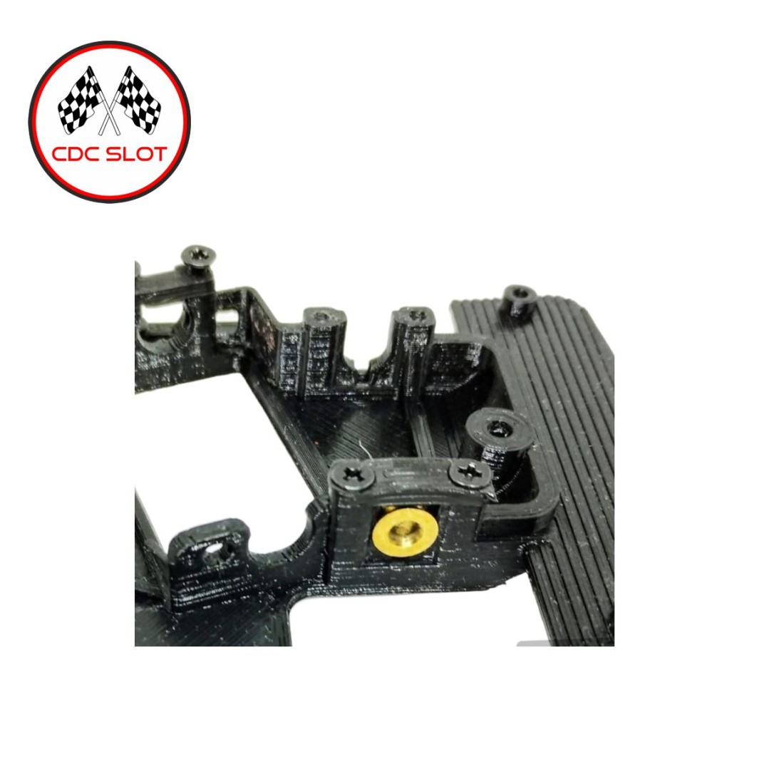 Chasis 3D MBAWR (monoblock anglewinder con offset regulable) para Mitsubishi Evo V/VI de Scaleauto. Offset regulable desde 0,0 hasta 1,0 mediante espárragos allen M2. Se incluye también dos tapas para el alojamiento de los cojinetes. Uno para el offset en 0,0 y otro juego para regular el offset desde 0,0 hasta 1 mm. Compatible con cojinetes de 2 pestañas y con cojinete Combi Plus de 29,90 mm de Sloting Plus. Eje delantero regulable en altura mediante tornillos allen M2. Con pasacables. Apto para motores de caja larga y compatible con guías de 3,5 mm de diámetro en el eje. Flexible y resistente.