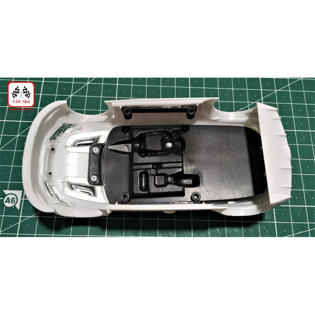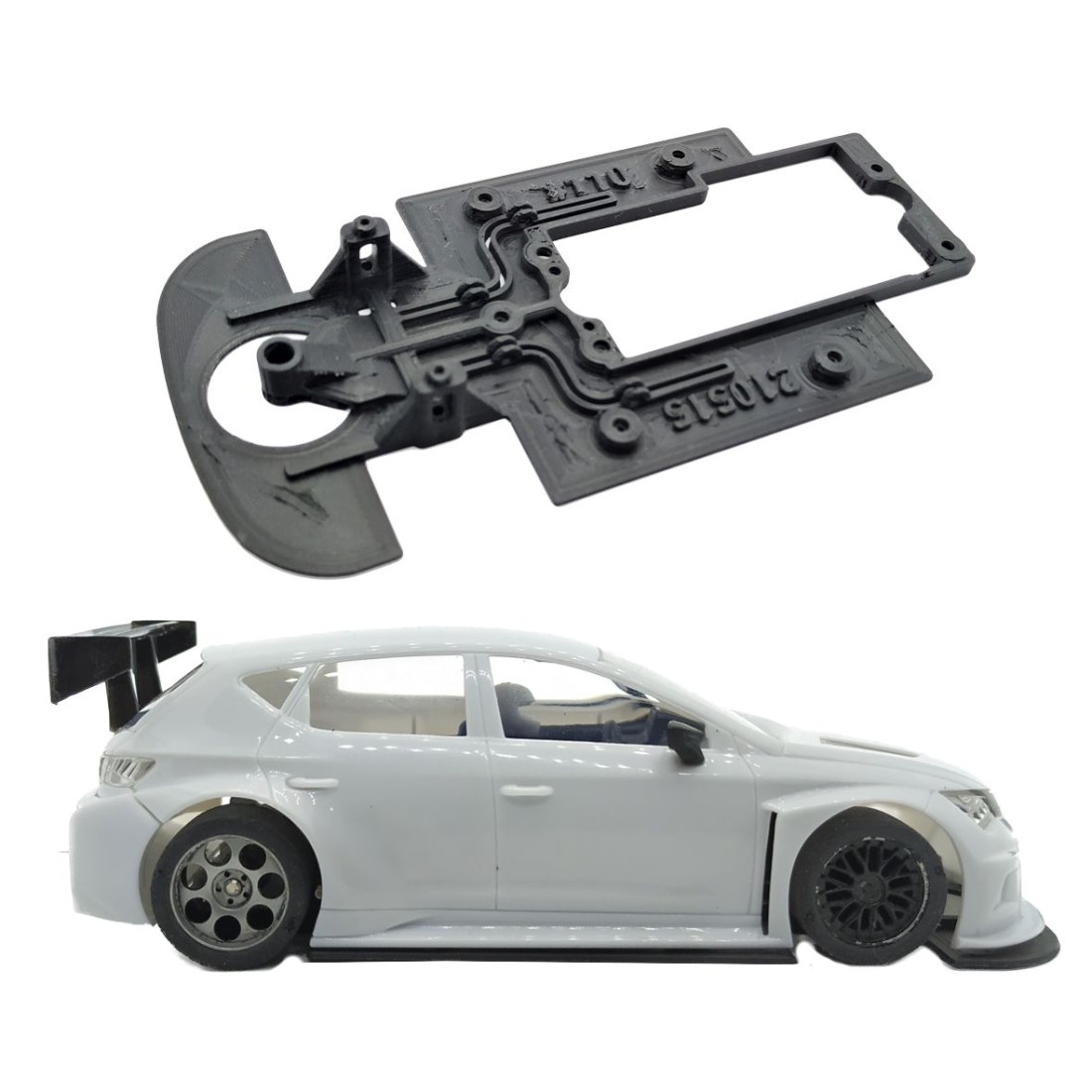 Chasis 3D para Seat León de Ninco para bancada independiente en sidewinder o en línea. Eje delantero regulable en altura mediante tornillos allen M2. Chasis modular con regulación de flexión mediante tornillos allen M2. Con pasacables. Compatible con soporte motor Slot.It o CDC Slot. Flexible y resistente. Contiene el chasis, un centrador y los soportes laterales. Se atornillan los soportes laterales al centrador y éste se debe colocar con la flecha apuntando hacia el morro del coche. Los bordes del centrador deben coincidir con los pasos de rueda. Una vez centrado, se colocan unas pinzas de sujeción y se procede a aplicar un poco de pegamento (cianocrilato), éste unirá las piezas por capilaridad. Cuando esté bien seco, se retiran las pinzas y los tornillos y se puede repasar la unión de las piezas con más pegamento.