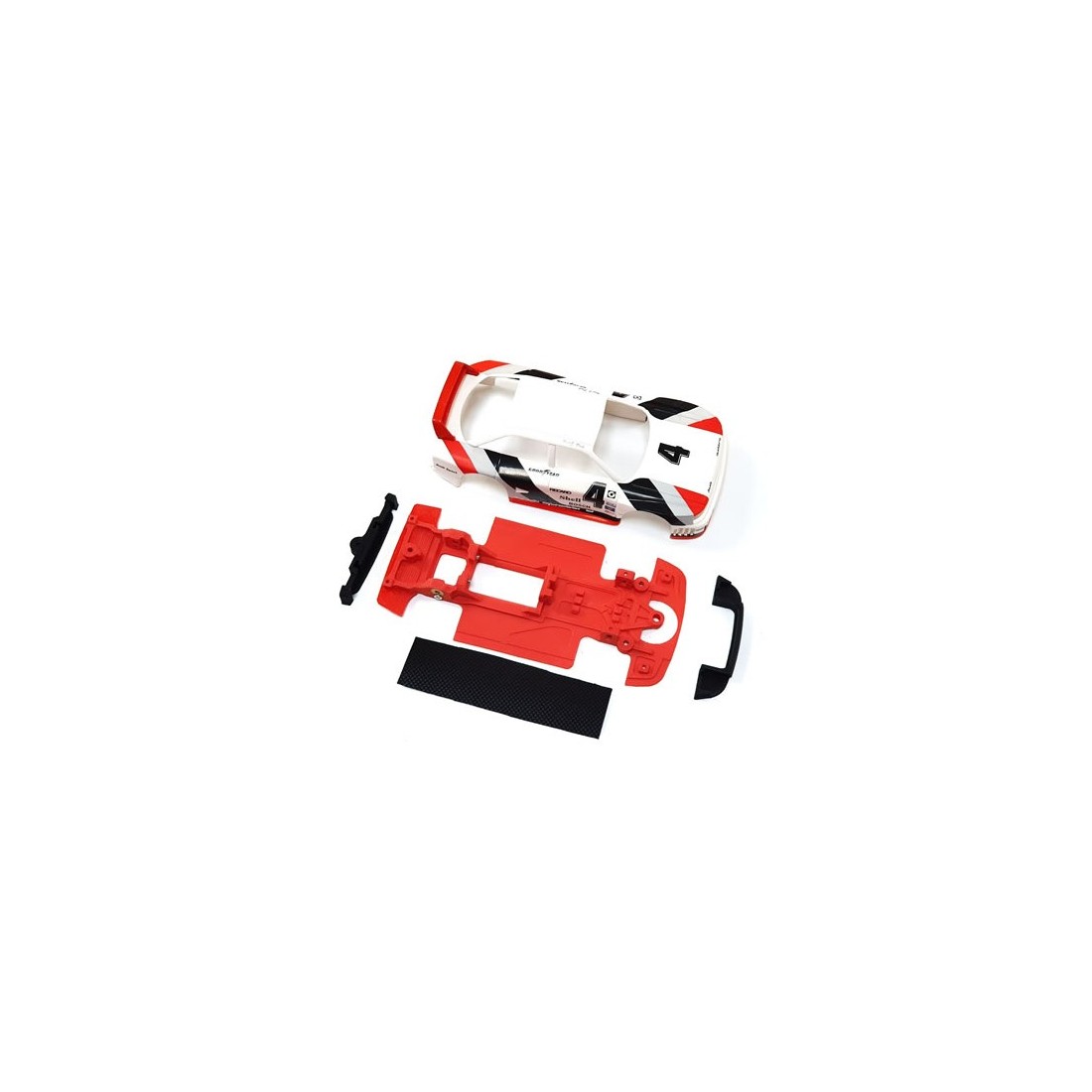 Chasis diseñado para poder se utilizar con el interior de serie eliminando los cuatro pilares que van desde este hacia los ejes y también se puede utilizar colocando interior de lexan e instalando las dos parrillas negras , delantera y trasera, que vienen con el chasis, que es donde se colocan las luces delanteras y traseras y el tornillo trasero de sujeción del chasis.