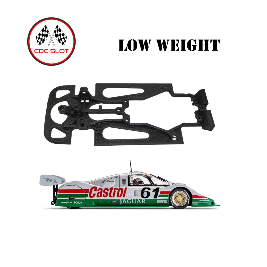 Chasis 3D SKRT3 para Jaguar XJR10 Slot.it. Eje delantero regulable en altura. Con pasacables. Compatible con soporte motor Slot.It, Sideways y RT3 de Scaleauto y con guías de 3,5 mm de diámetro en su eje. Flexible, resistente y más ligero.