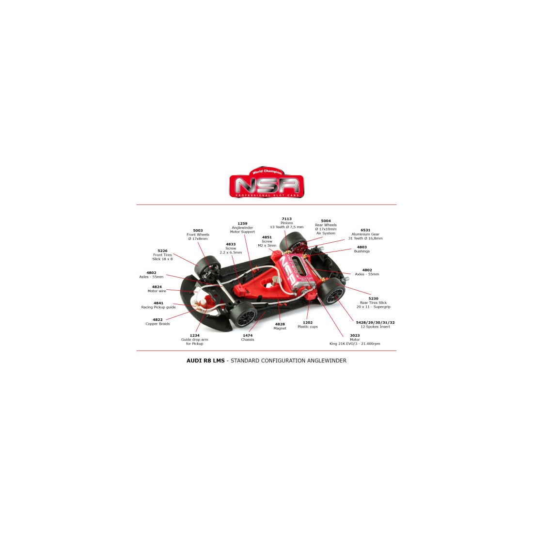 Este Audi R8 NSR viene con chasis negro de dureza media y cuna en ángulo triangular. Este chasis tiene regulación por tornillos del eje delantero.