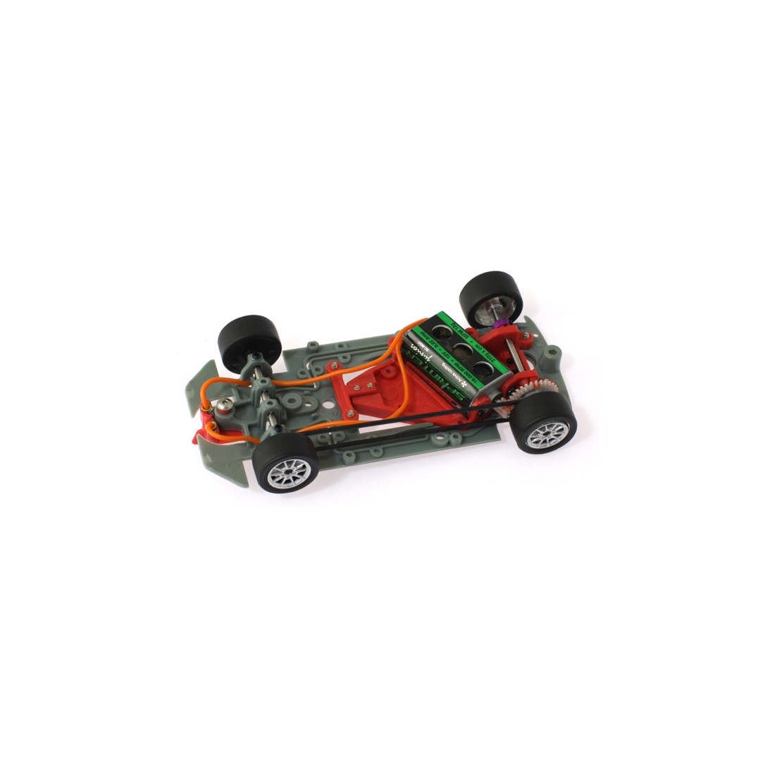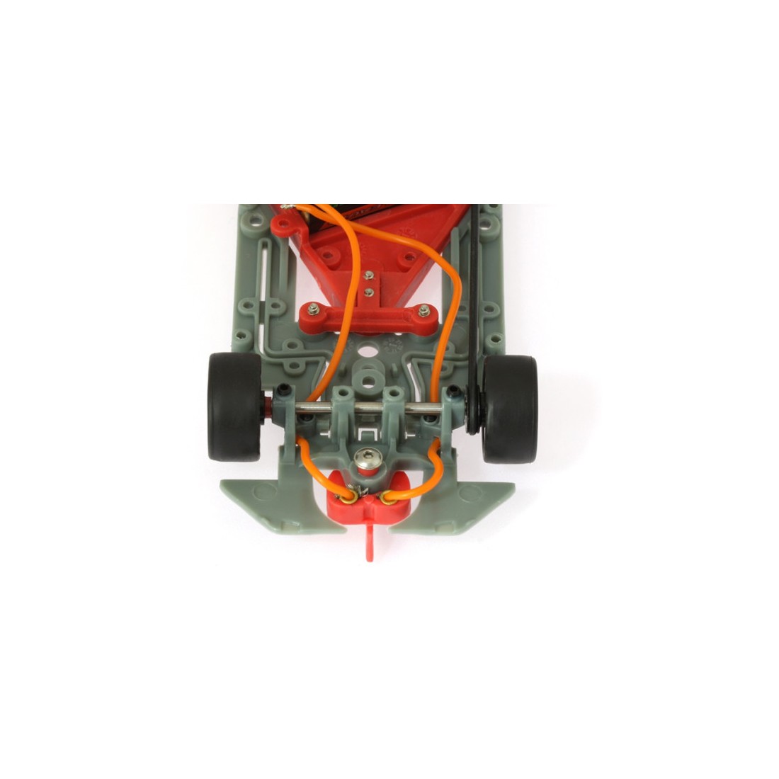Este Peugeot 208 de Scaleauto viene con un chasis blando y cuna en ángulo con ofset para acercar todo lo posible el motor al carril y aprovechar el efecto imán del mismo.