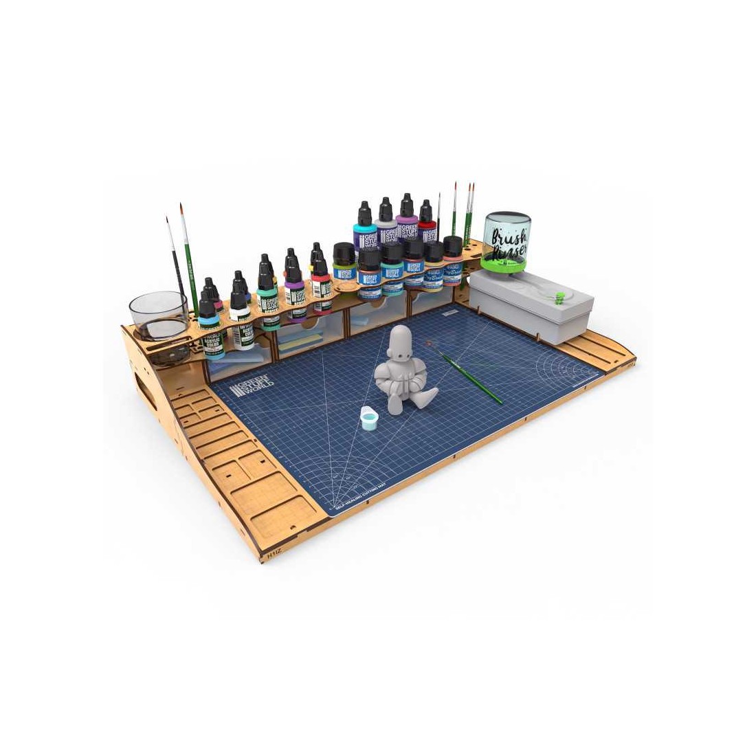 Este artículo se entrega sin montar. Se recomienda el uso de cola blanca para reforzar el ensamblado. Todos los elementos mostrados en las fotografías como pinturas, pinceles, herramientas o miniaturas son ilustrativos y no están incluidos, salvo el tapete de corte.