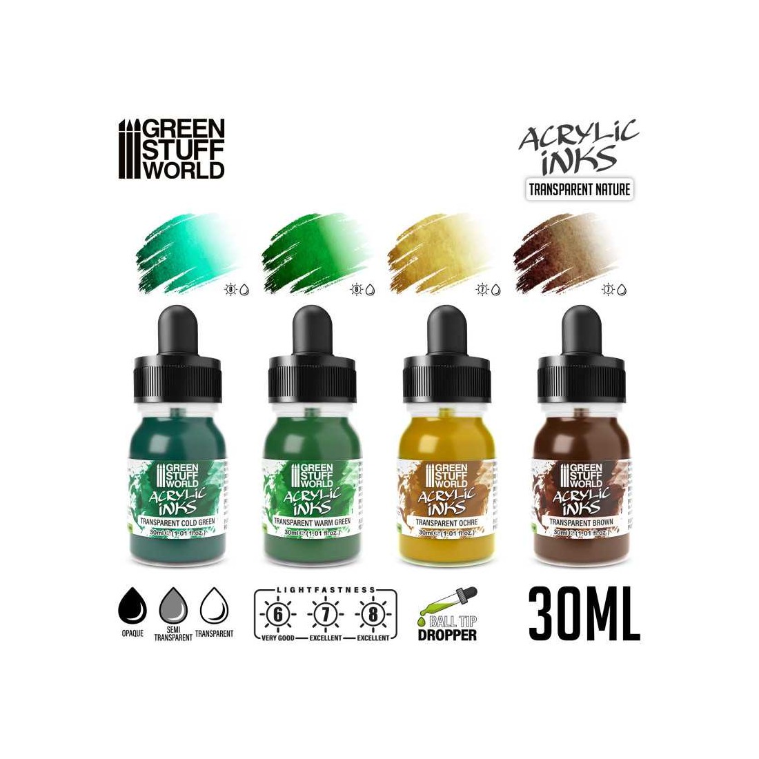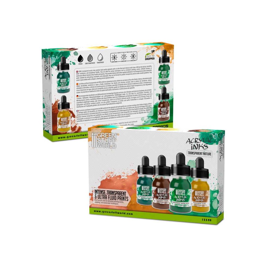 Los sets de tintas acrílicas transparentes de Green Stuff World están especialmente diseñados para ofrecer la máxima versatilidad en la creación de efectos visuales en miniaturas, dioramas y maquetas. Su avanzada fórmula combina pigmentos de alta calidad con una base acrílica ultraligera, ideal para técnicas como veladuras, efectos pictóricos tipo acuarela o incluso para ilustración estilo cómic.